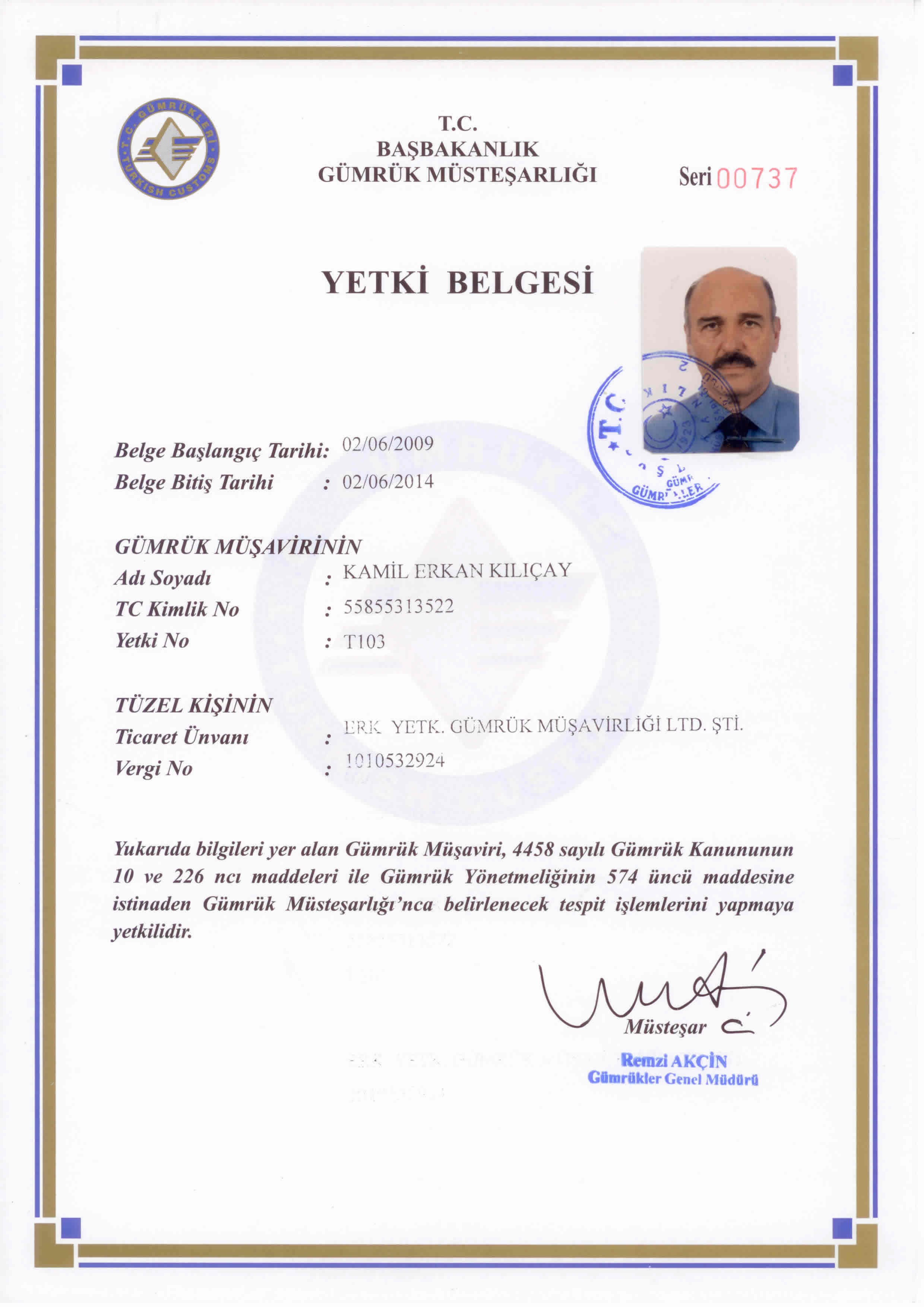 Gümrük Müsteşarlığı’nda 35 yıllık hizmeti müteakiben, 2000 yılında Gümrükler Başmüdürlüğü görevinden emekliye ayrılan Kamil Erkan KILIÇAY, 02.06.2009 tarihinden bu yana Yetkilendirilmiş Gümrük Müşaviri olarak hizmet vermektedir. Yetki Belgesi