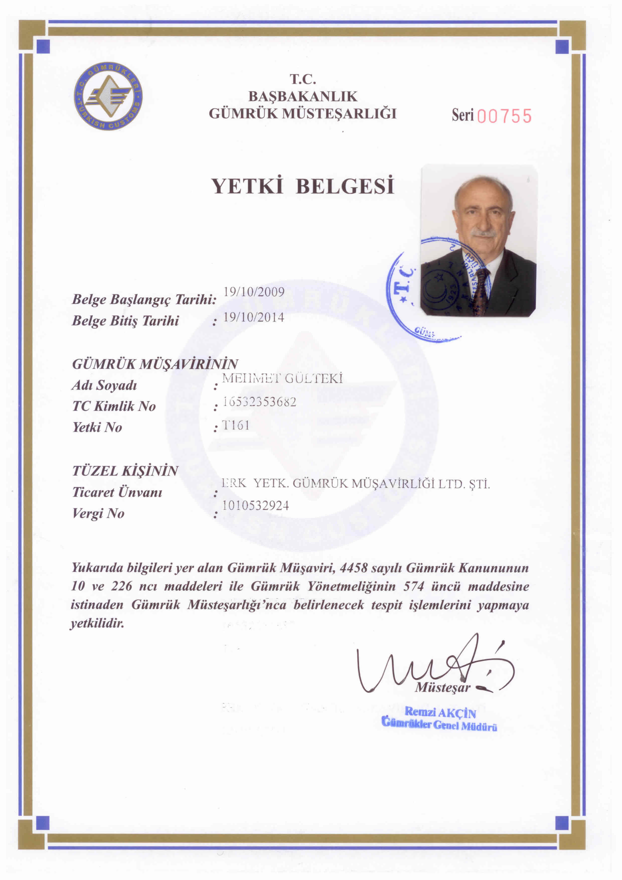 Gümrük Müsteşarlığı’nda 35 yıllık hizmeti müteakiben, 2009 yılında Gümrük Müdürlüğü görevinden emekliye ayrılan Mehmet GÜLTEKİ , 01.09.2009 tarihinden bu yana Yetkilendirilmiş Gümrük Müşaviri olarak hizmet vermektedir.Yetki Belgesi |