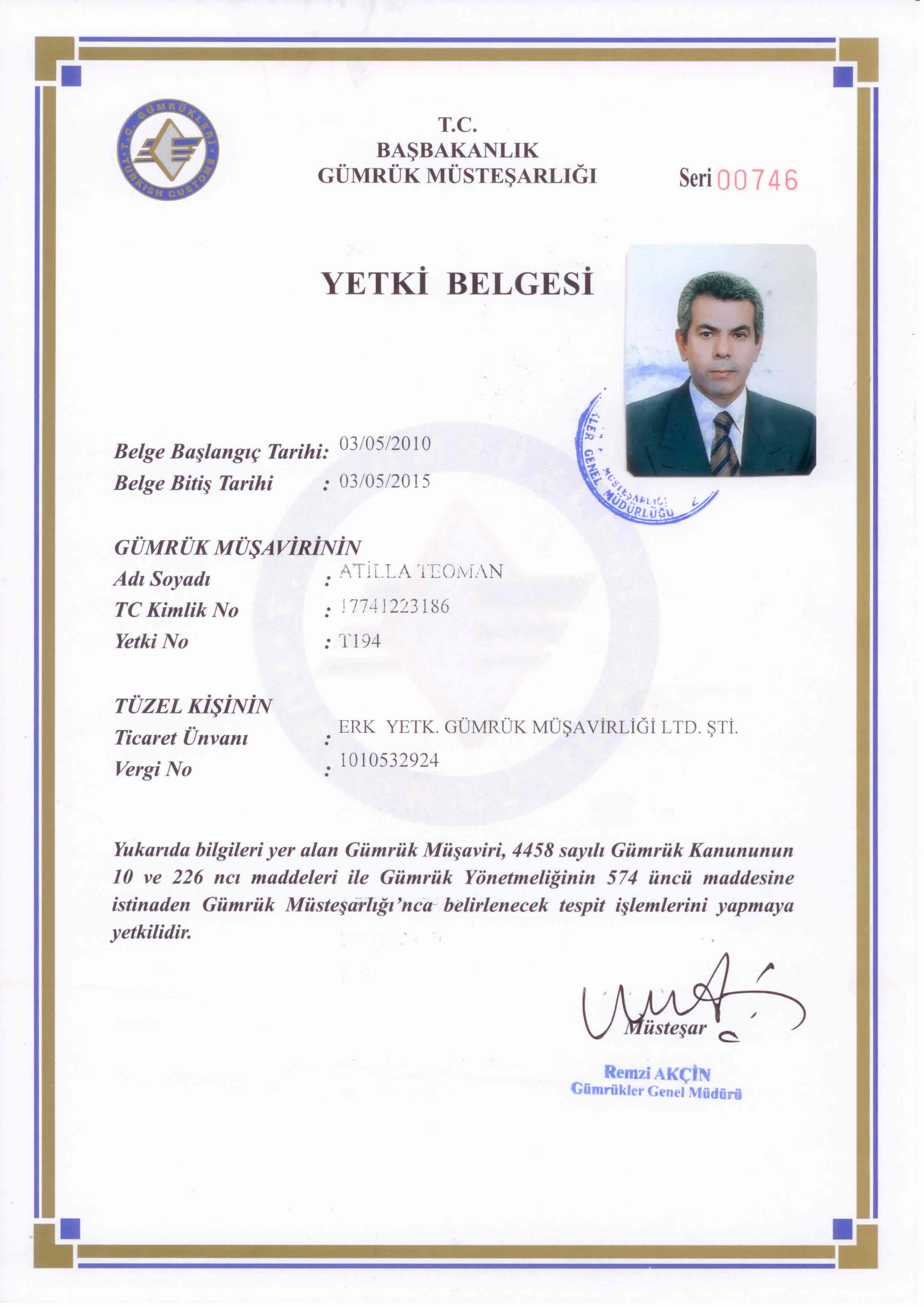 Gümrük Müsteşarlığı'nda 35 yıllık hizmeti müteakiben, 2009 yılında Gümrükler Muayene Memurluğu görevinden emekliye ayrılan Attila TEOMAN, 03.05.2010 tarihinden bu yana Yetkilendirilmiş Gümrük Müşaviri olarak hizmet vermektedir.Yetki Belgesi |
