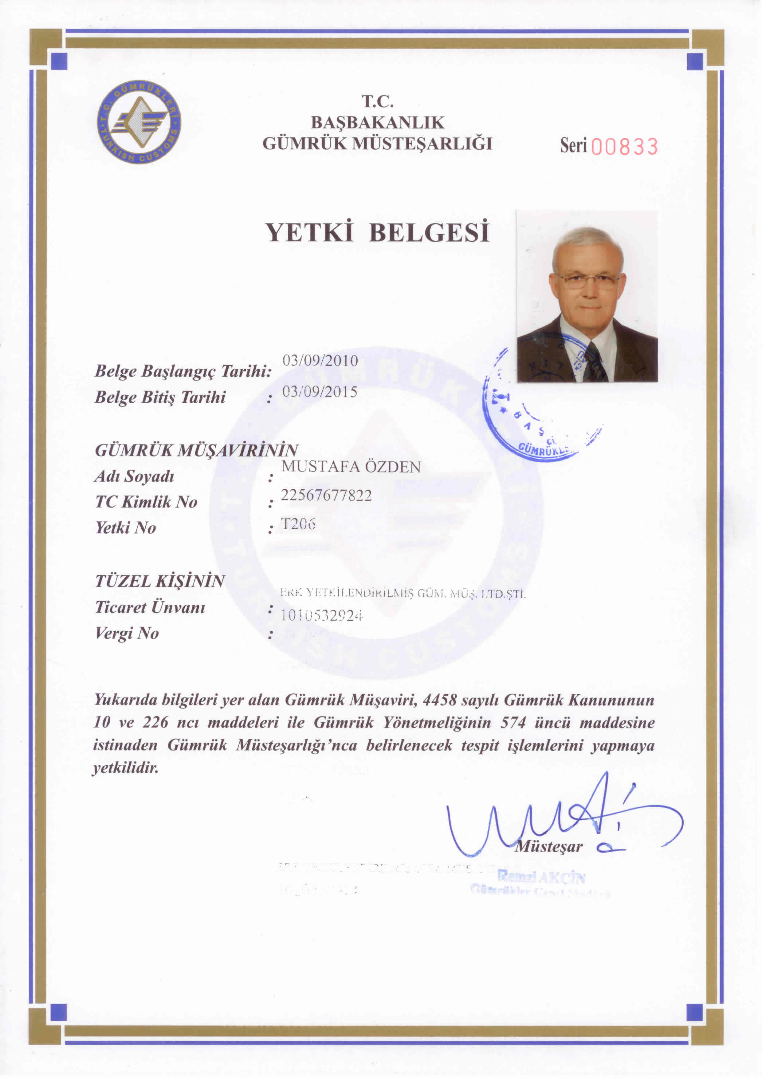 Gümrük Müsteşarlığı'nda 35 yıllık hizmeti müteakiben, 2009 yılında Gümrükler Muayene Memurluğu görevinden emekliye ayrılan Mustafa ÖZDEN, 03.09.2010 tarihinden bu yana Yetkilendirilmiş Gümrük Müşaviri olarak hizmet vermektedir.Yetki Belgesi |