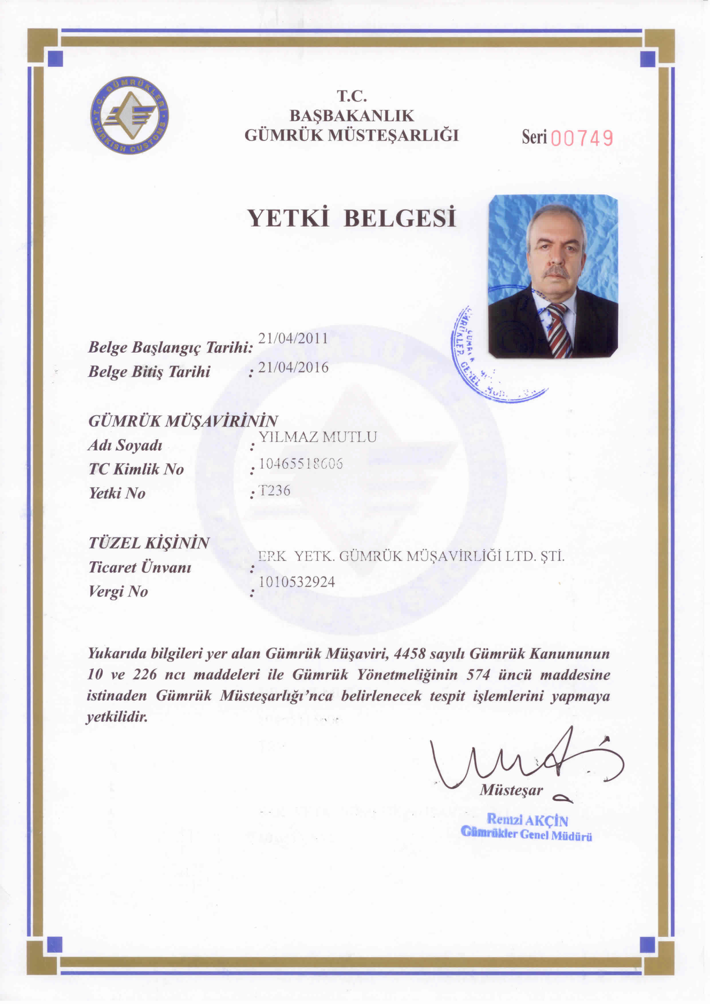 Gümrük Müsteşarlığı'nda 30 yıllık hizmeti müteakiben, 2011 yılında Gümrükler Servis Şefliği görevinden emekliye ayrılan Yılmaz MUTLU , 18.04.2011 tarihinden bu yana Yetkilendirilmiş Gümrük Müşaviri olarak hizmet vermektedir.Yetki Belgesi |