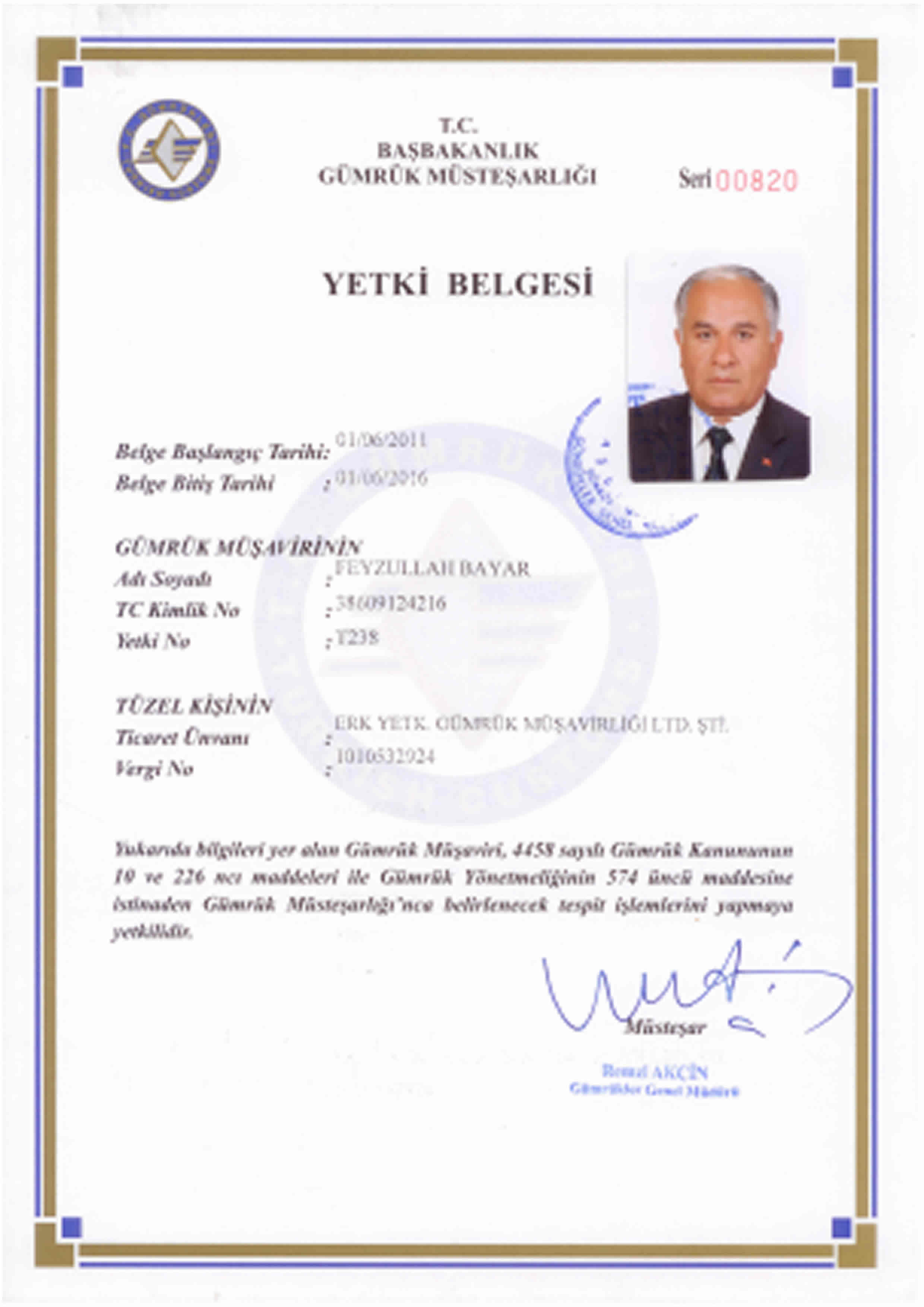 Gümrük Müsteşarlığı'nda 30 yıllık hizmeti müteakiben, 2011 yılında Gümrük Müdürlüğü görevinden emekliye ayrılan Feyzullah BAYAR, 18.04.2011 tarihinden bu yana Yetkilendirilmiş Gümrük Müşaviri olarak hizmet vermektedir.Yetki Belgesi |