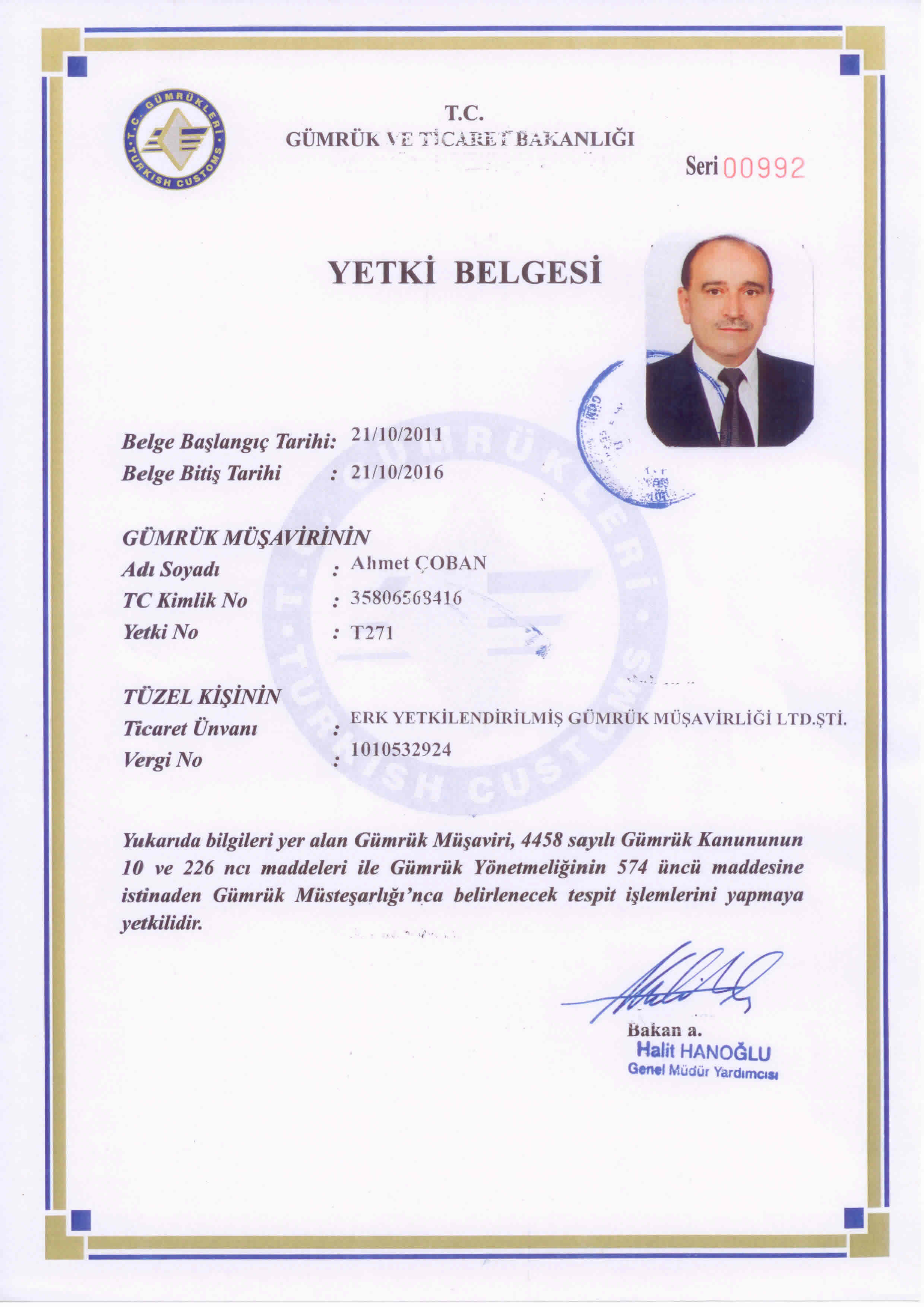 Gümrük Müsteşarlığı'nda 25 yıllık hizmeti müteakiben, 2011 yılında Gümrük Müdürlüğü görevinden emekliye ayrılan Ahmet ÇOBAN , 18.09.2011 tarihinden bu yana Yetkilendirilmiş Gümrük Müşaviri olarak hizmet vermektedir.Yetki Belgesi |