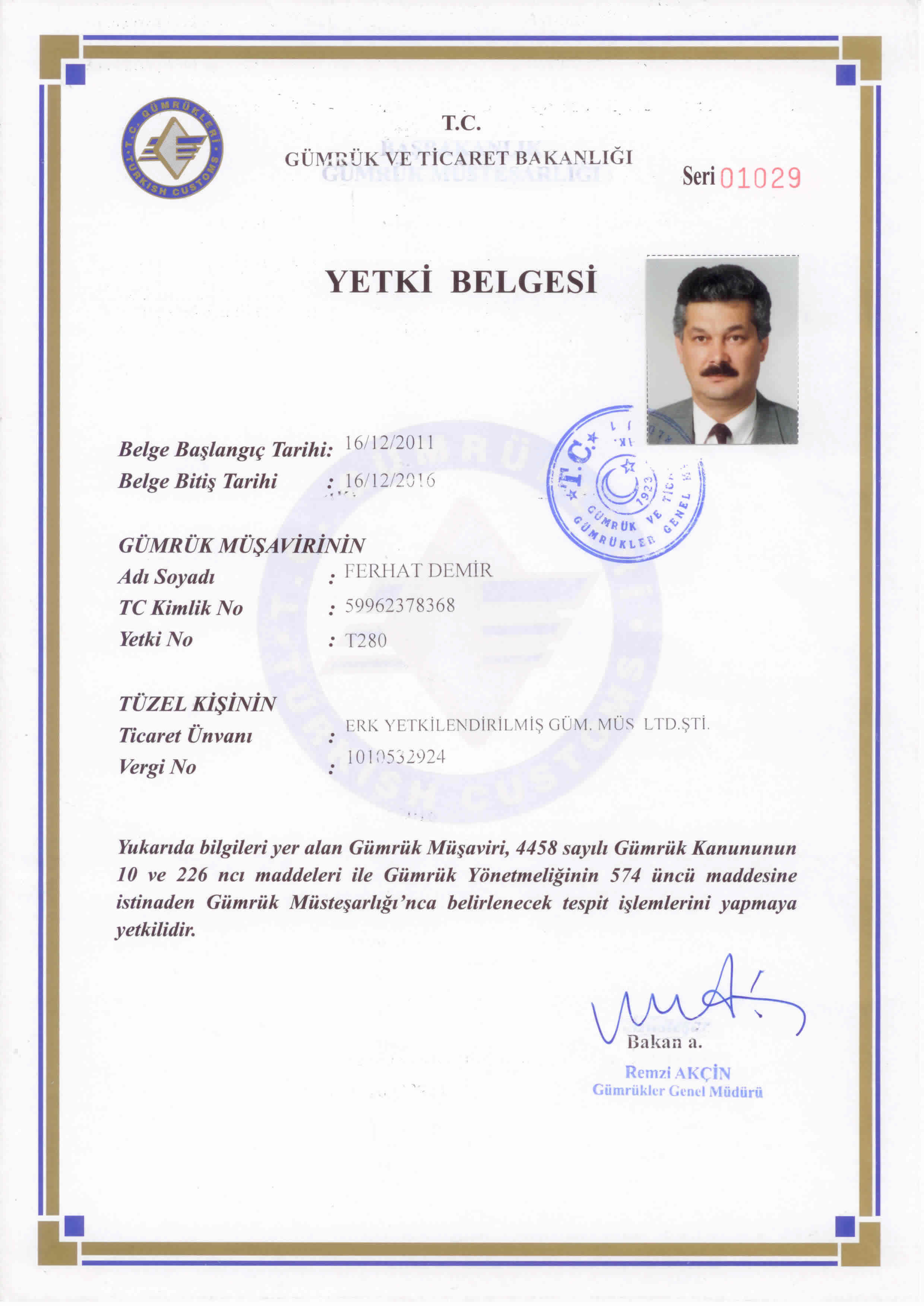 Gümrük Müsteşarlığı'nda 25 yıllık hizmeti müteakiben, 2011 yılında Gümrük Muayene Memurluğugörevinden emekliye ayrılan Ferhat DEMİR, 18.09.2011 tarihinden bu yana Yetkilendirilmiş Gümrük Müşaviri olarak hizmet vermektedir.Yetki Belgesi |