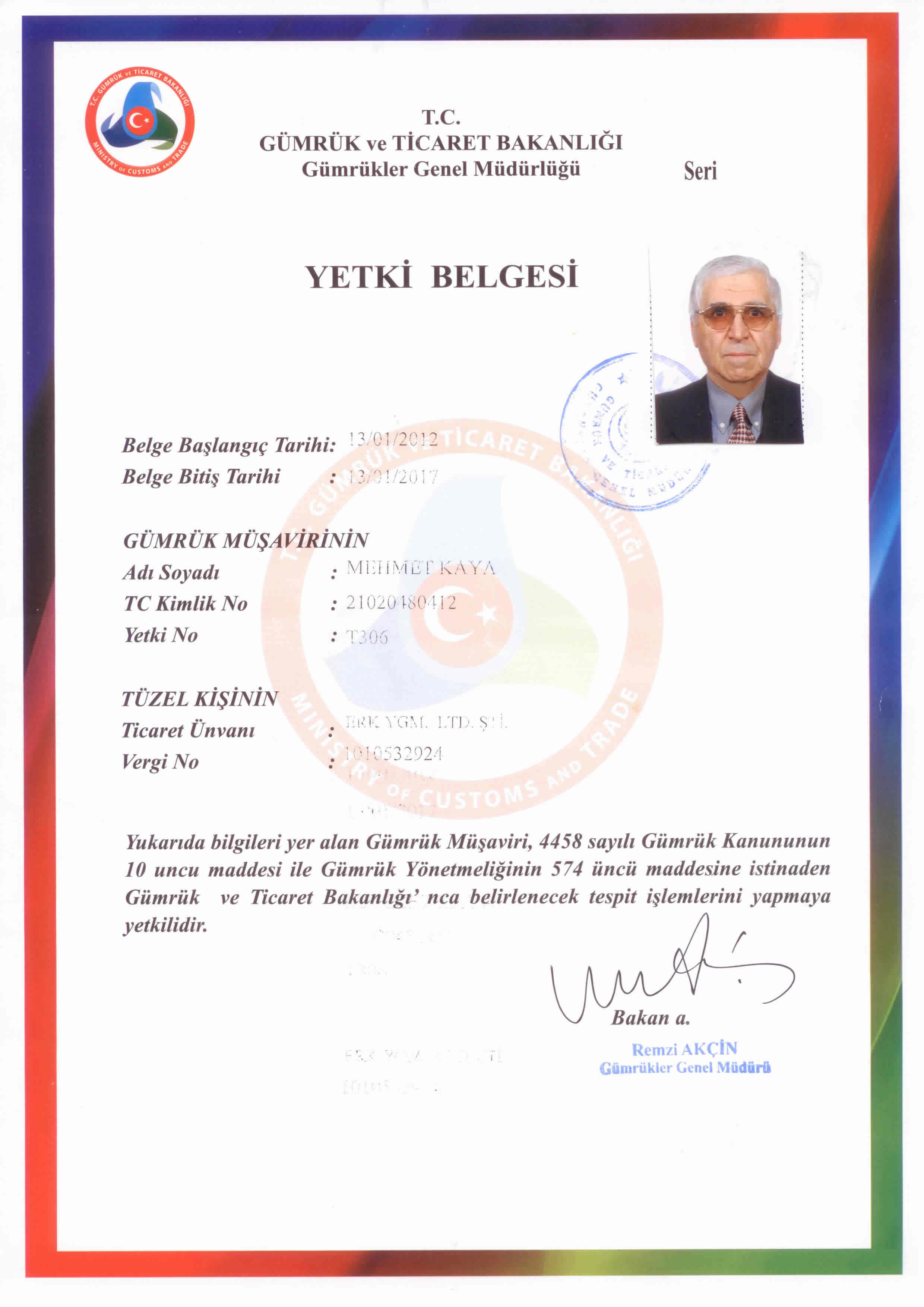Gümrük Müsteşarlığı'nda 25 yıllık hizmeti müteakiben, 2011 yılında Gümrük Muayene Memurluğugörevinden emekliye ayrılan Mehmet KAYA , 28.12.2011 tarihinden bu yana Yetkilendirilmiş Gümrük Müşaviri olarak hizmet vermektedir.Yetki Belgesi |